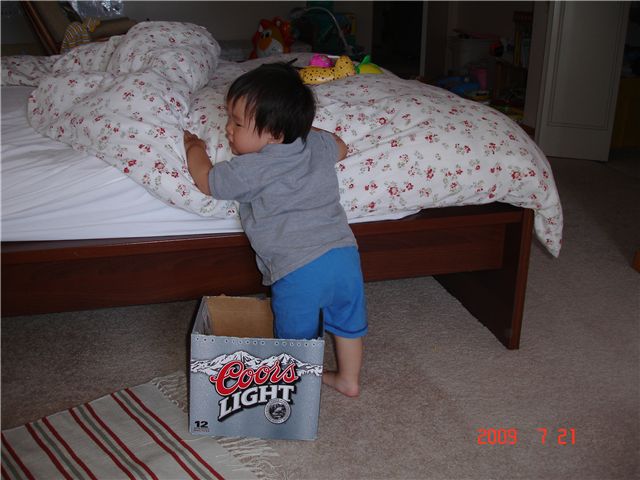 本來坐在紙箱裡, 後來站在紙箱想爬上床