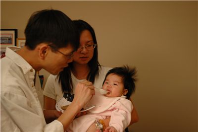 爹地餵我吃一小口蛋糕, 上面沾滿了一堆口水, 然後叫媽咪吃下去!!