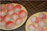 滿四個月應該要吃紅龜糕, 但媽咪找不到, 所以用小壽桃替代 !
