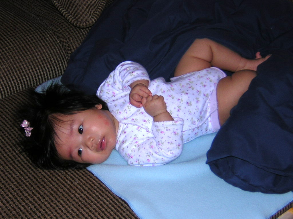 Felicia躺在客廳沙發上時, 會抬頭偷看電視.