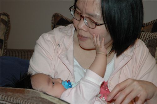 Felicia吃完奶還不想睡時, 會摸摸媽咪的臉並和媽咪說話.