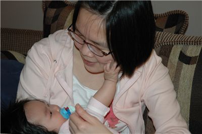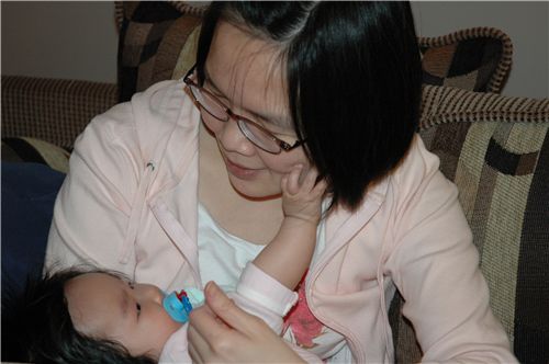 媽咪不吃我的小手手, 只好再摸摸媽咪的臉臉.