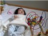 Felicia一邊玩珠珠, 一邊抬頭看會飛飛的窗簾