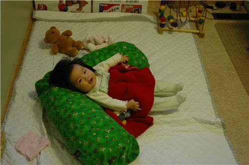 這個綠枕頭是媽咪餵奶時用來放Felicia在上面的, 如此一來可以讓媽咪多出兩隻手來, 現在這個綠枕頭是Felicia的新玩具了.