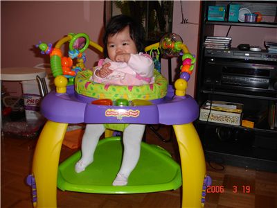 下面綠色的板子是讓baby學習蹬腳尖用的, 一蹬就會發出聲音, Felicia現在的腿還很短, 還有四格可以往下調整.