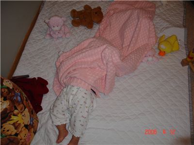 Felicia自己在地上玩, 居然可以把四摺蓋在肚上的小被子, 玩成這個樣子
