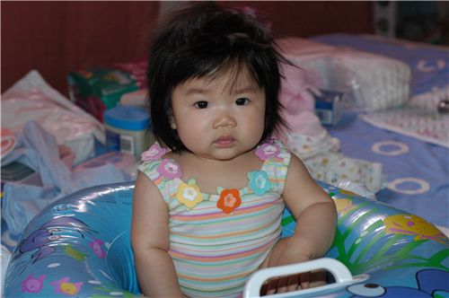 Felicia第一次穿泳裝, 在床上乾泳, 等媽咪放水.