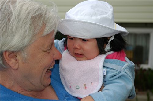 要回家了, Carol奶奶把Felicia放回推車後Felicia馬上大哭, 奶奶只好又抱起來惜惜一下下.