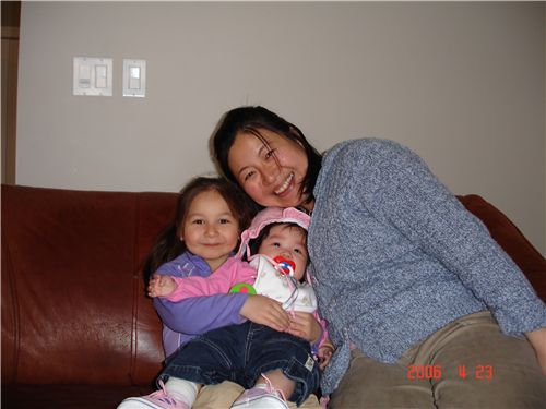 Felicia累累要回家睡覺了, 和Amelie還有Sonia阿姨來張合照, 看Amelie抱Felicia抱的多穩.