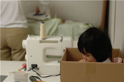 媽咪忙著幫我做窗簾, 所以讓我坐在紙箱裡頭玩, 我有小布布可以玩哦.