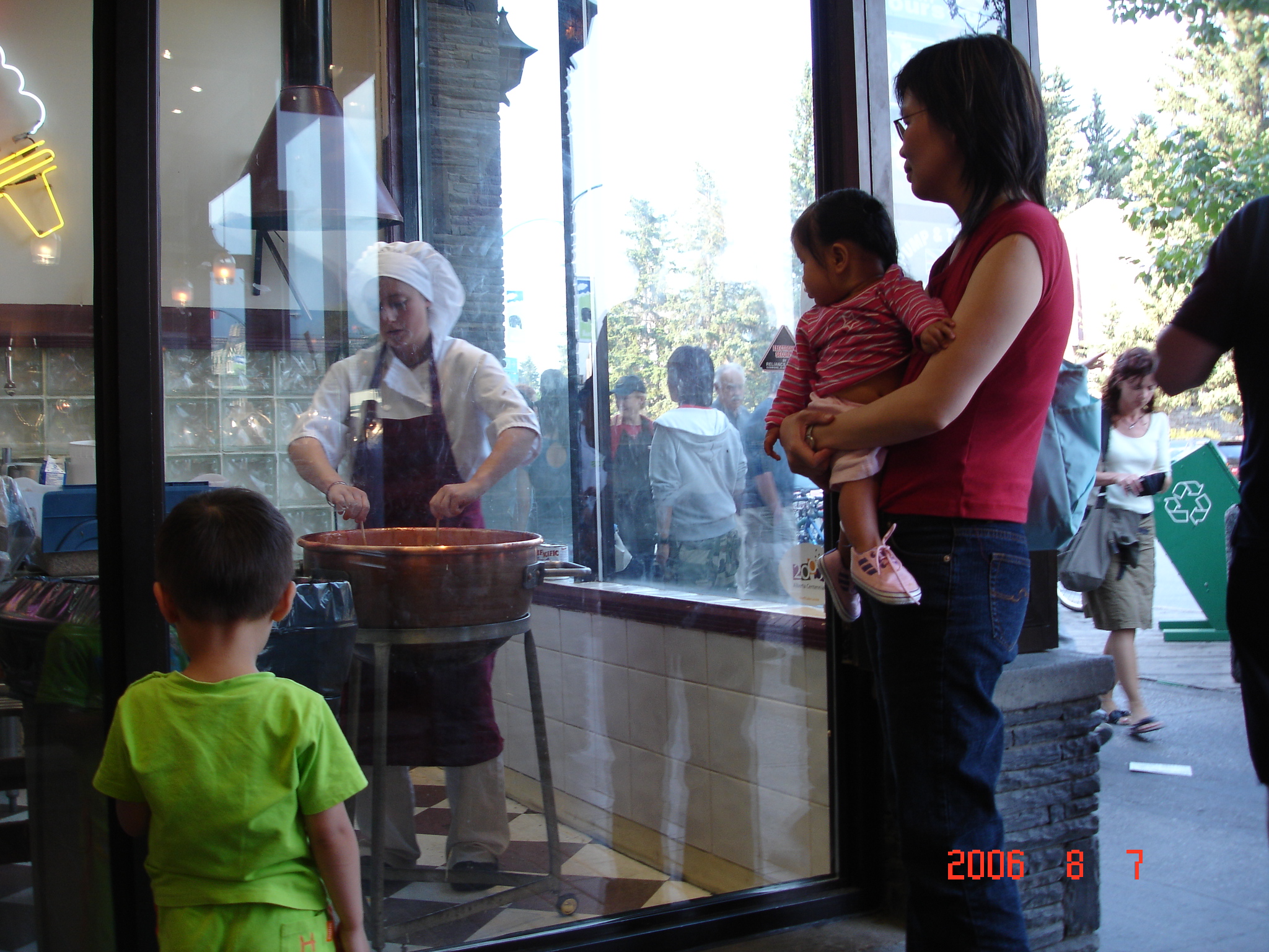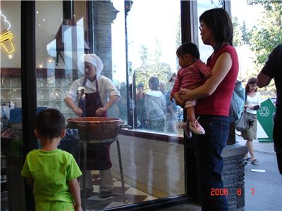 兩個小朋友盯著玻璃廚窗, 看阿姨如何製做蘋果巧克力.