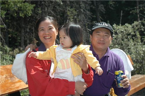 Felicia和梁爺爺梁奶奶在露易絲湖前