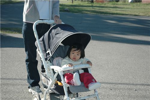 Felicia愈來愈不愛坐推車, 總是要被抱著逛, 媽咪和她堅持了一下, 等Felicia坐定後, 才開始今早的散步.