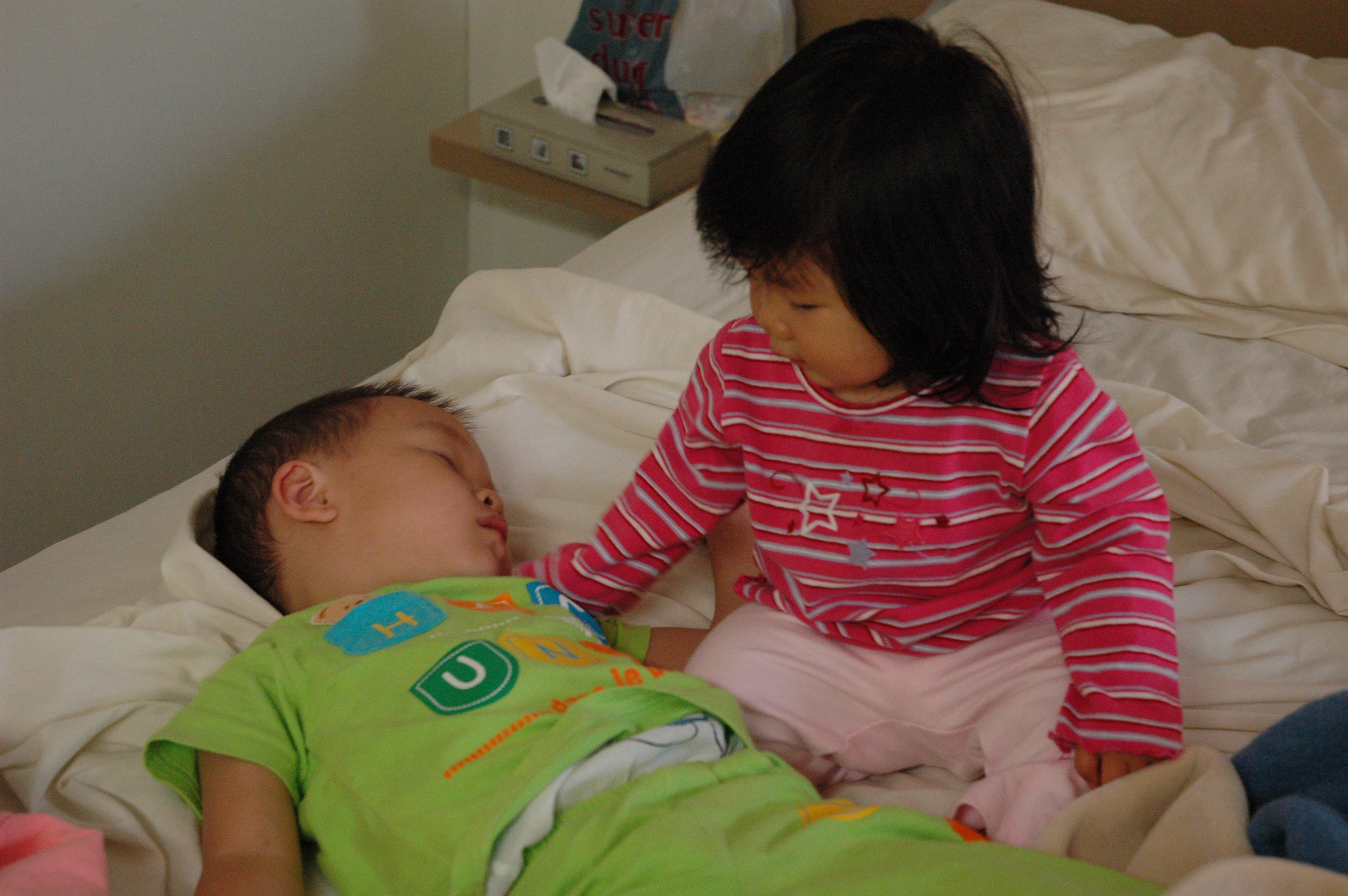 第三天早晨大家都已起床梳洗完畢了, Henry哥哥還在賴床, Felicia上床叫哥哥起床.