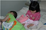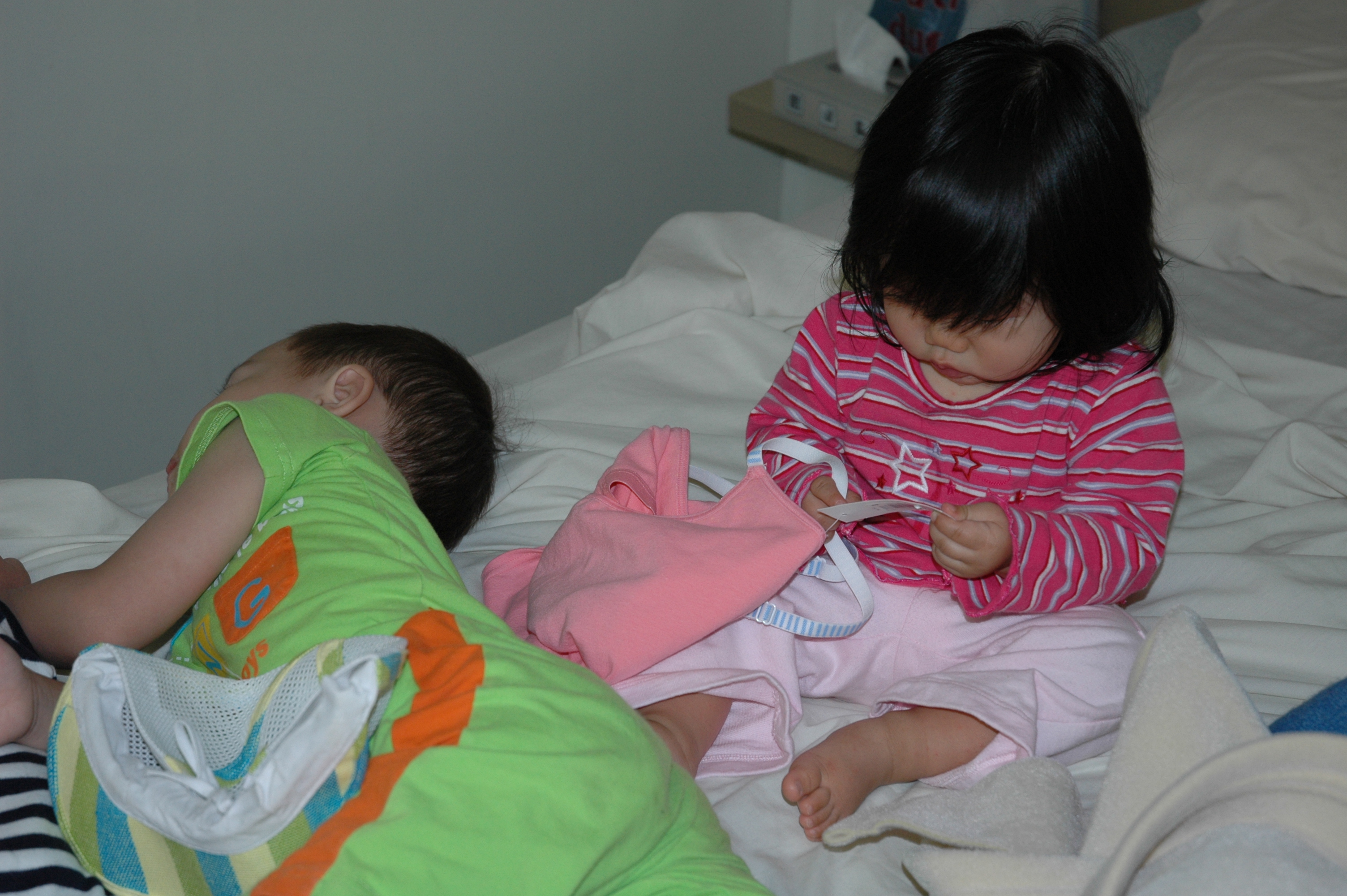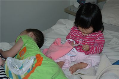 Felicia開始專心玩起衣服掛牌了, 不管哥哥了.