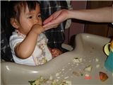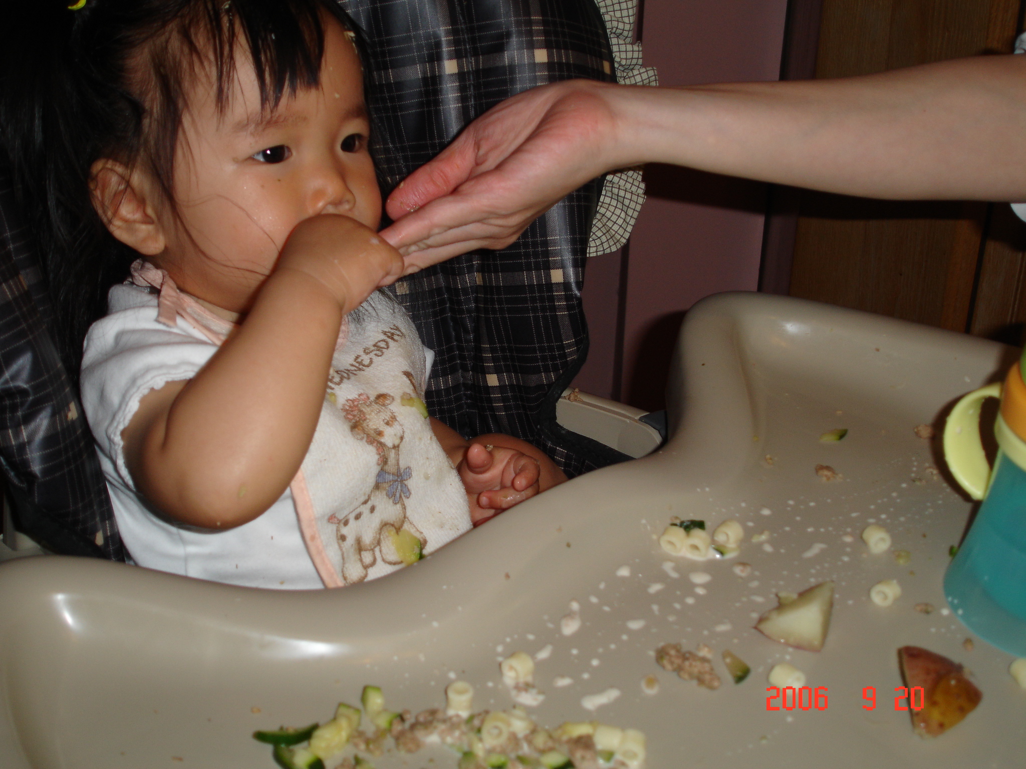 當餐盤的食物變少時, Felicia就會把它全部倒在桌上, 比較好拿她想吃的東西.