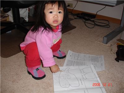 媽咪上網收信, Felicia在旁悄悄的把桌上的書往下拉, 然後就....直接在上面塗鴨起來了.