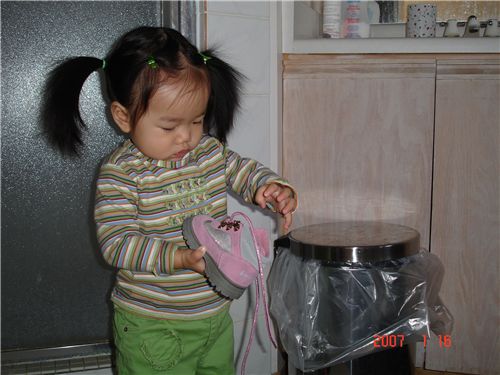 玩鞋帶是Felicia的另一個喜好, 會把鞋帶一個洞一個洞解開.