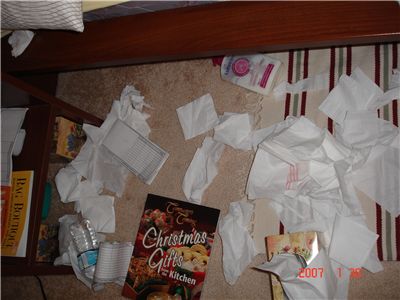 Felicia很喜歡玩衛生紙, 趁著媽咪打盹的一下下時間, 床頭櫃裡的東西, 全被搬到地上, 衛生紙更是丟的到處都是...