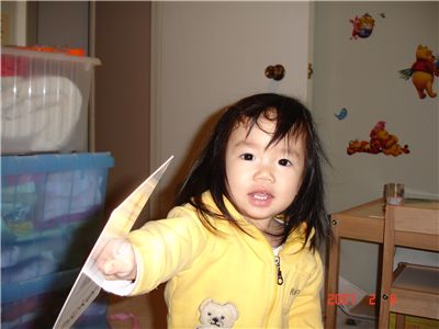 媽咪請Felicia拿著她的最愛照張相, 可是她卻一直拿著雞卡往媽咪方向過來.