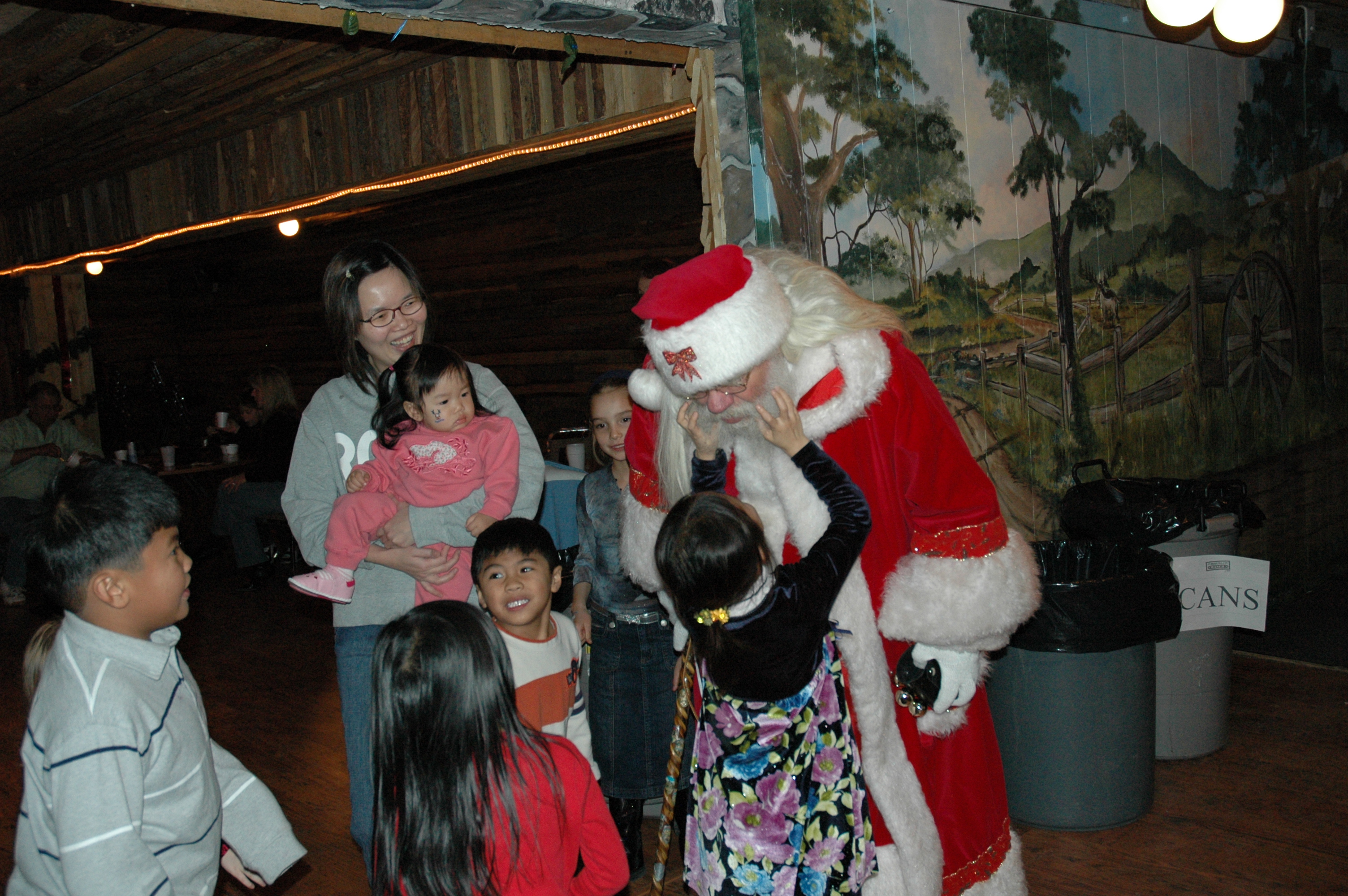 聖誕老公公彎腰讓小朋友摸鬍子說: 你看看我是不是真的?