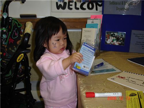 Felicia一進入CIWA, 看到小桌上有許多的廣告紙, 就自己在一旁玩了起來.