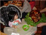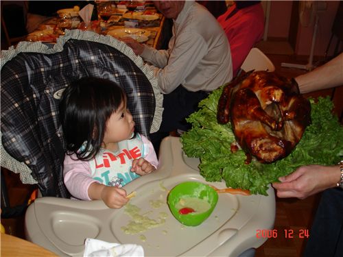 Felicia坐在火雞旁, 顯得好小一隻哦.