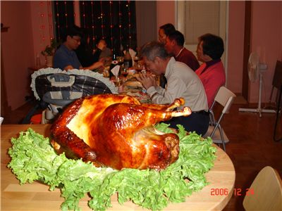 剛出爐的火雞, 今年烤比較大隻一點, 近七公斤, 還是小隻點省時又好吃.