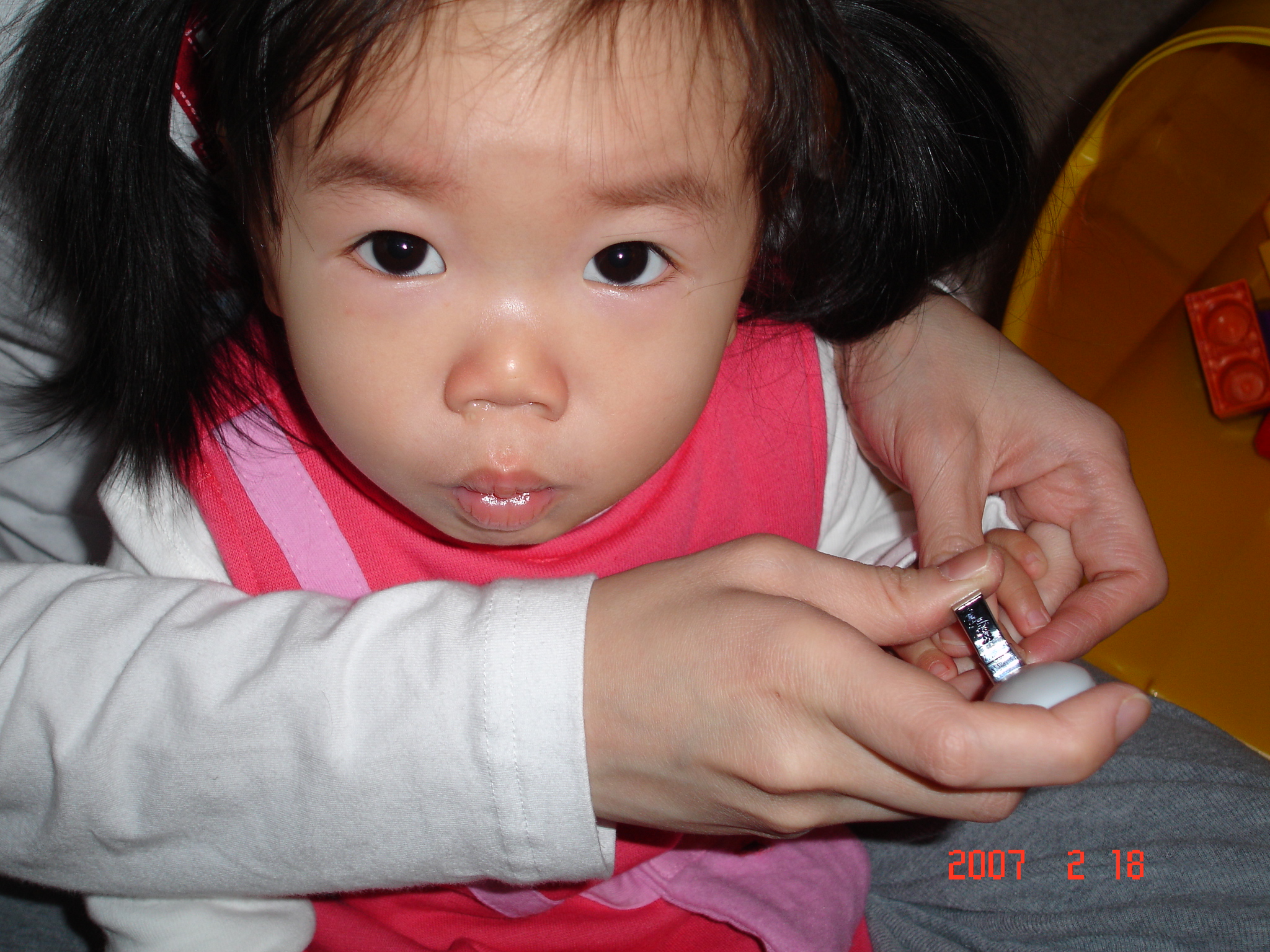 Felicia第一次拿著指甲剪請媽咪幫忙剪指甲, 通常媽咪要剪Felicia都不給剪的.