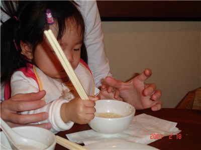 Felicia搶著自己用筷子夾碗裡的東西吃