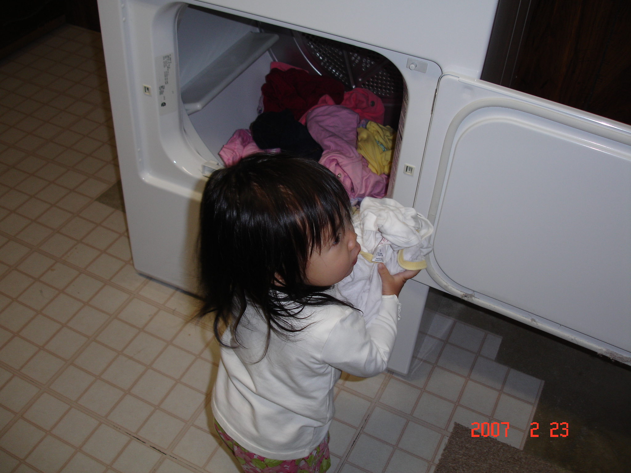 準備放進去烘乾機的同時, Felicia看到媽咪正拿出, 她最喜歡的衣服, 眼睛一直盯著衣服看.