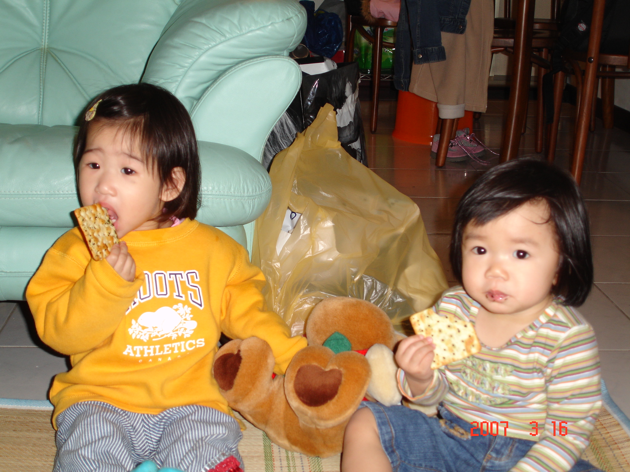 和Charelene姐姐一起分享餅乾. 吃雜食的比喝牛奶的小隻好多哦.