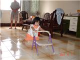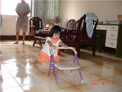 在高雄沒玩具玩, 這把小椅子就是Felicia每天必玩的玩具, 推著它到處走來走去, 有時也會坐在椅子上聽它發出"啾"啾"的聲音.