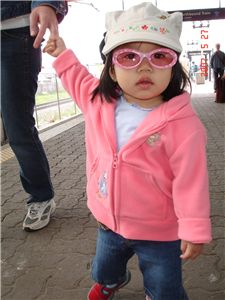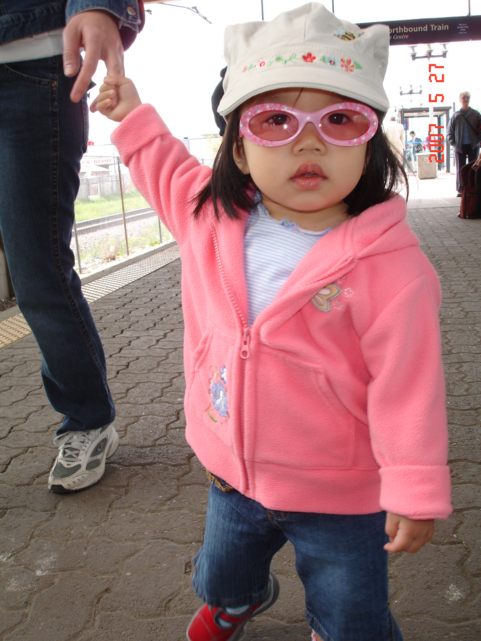 牽著媽咪的大手手, Felicia在月台上等C-Train, 順便和候車的乘客打招呼.