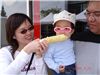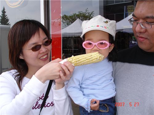 在Lilac的廣場上, 幸福的Felicia由乾爸抱著, 媽咪餵現烤玉米吃.