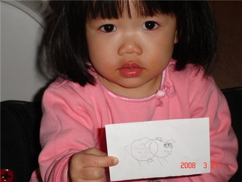 這是Felicia畫的第一隻乳牛, 有耳朵, 眼睛, ㄋㄟㄋㄟ, 身上條紋表示黑斑點, 不過這隻牛多了二隻腳^_^