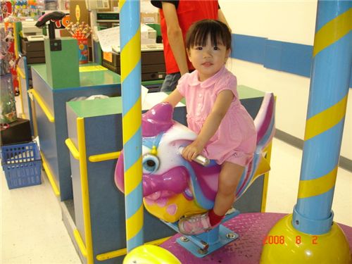 一個星期前來還不敢坐旋轉木馬, 今天自己爬上去說要坐.