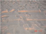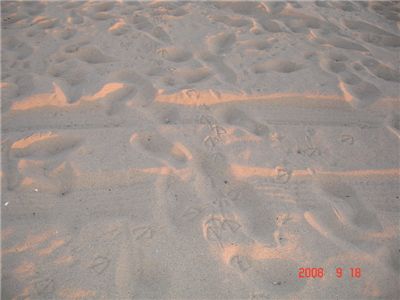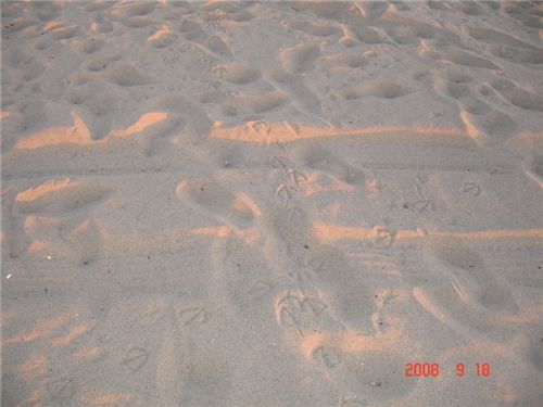 海邊有很多的海鳥, 沙灘上到處都是它們的腳印