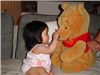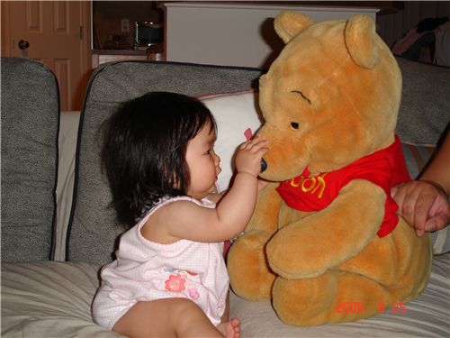 Felicia已經認得小熊維尼的樣子了, 第一次Felicia和比她大的小熊維尼打招呼, 摸摸它的鼻子後, 就把它抱過來Kiss一下, 可惜小相機只能照到前面畫面.