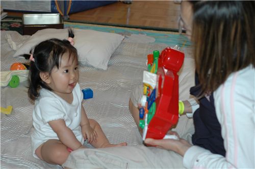 媽咪發現一件好玩的事, 一樣的玩具, 不一樣的人跟Felicia玩, 會有不同的效果, Felicia 好像突然間又多了好多新玩具一樣, 玩的很開心.