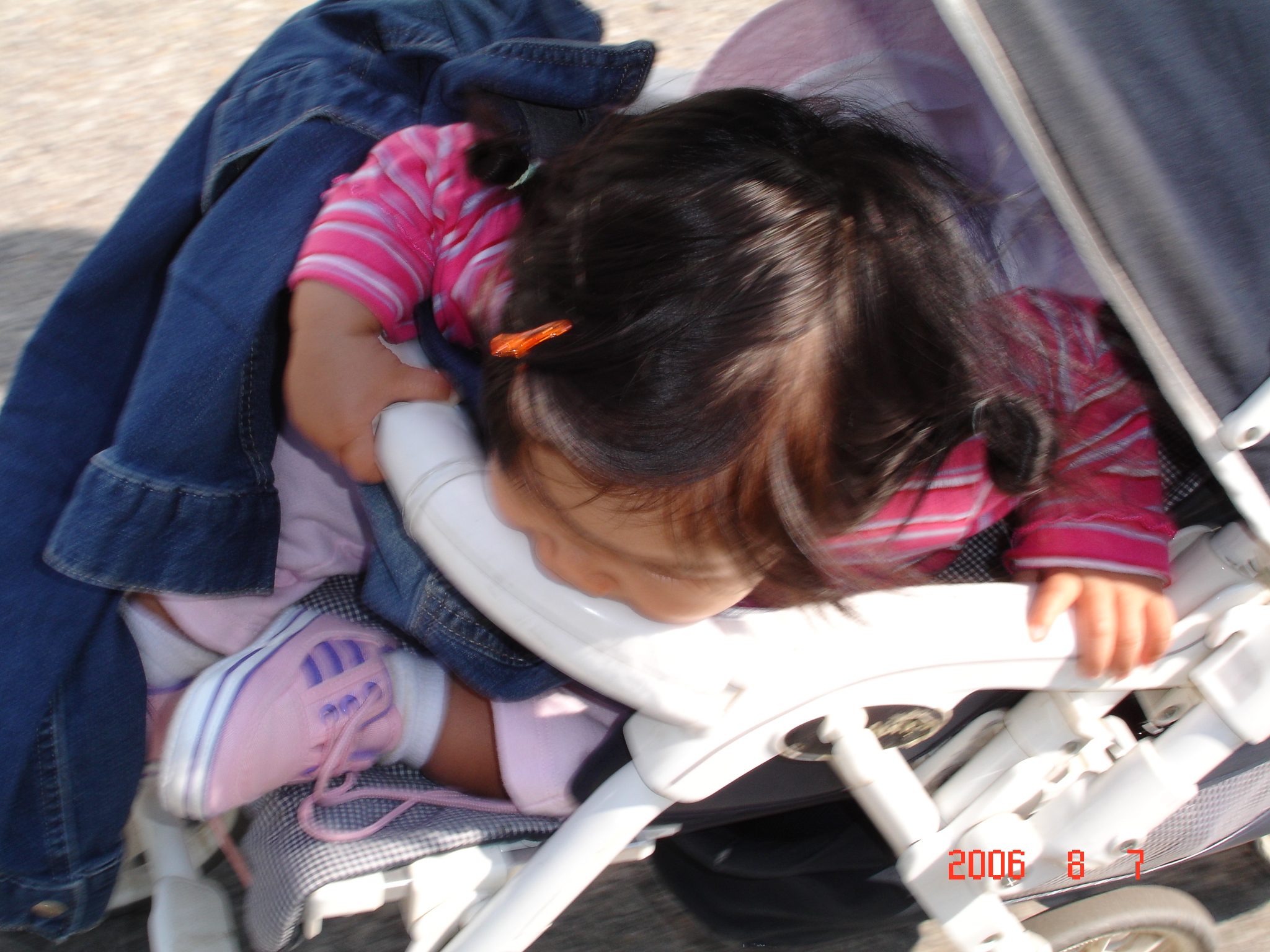Felicia什麼東西都啃, 連嬰兒推車也不放過.