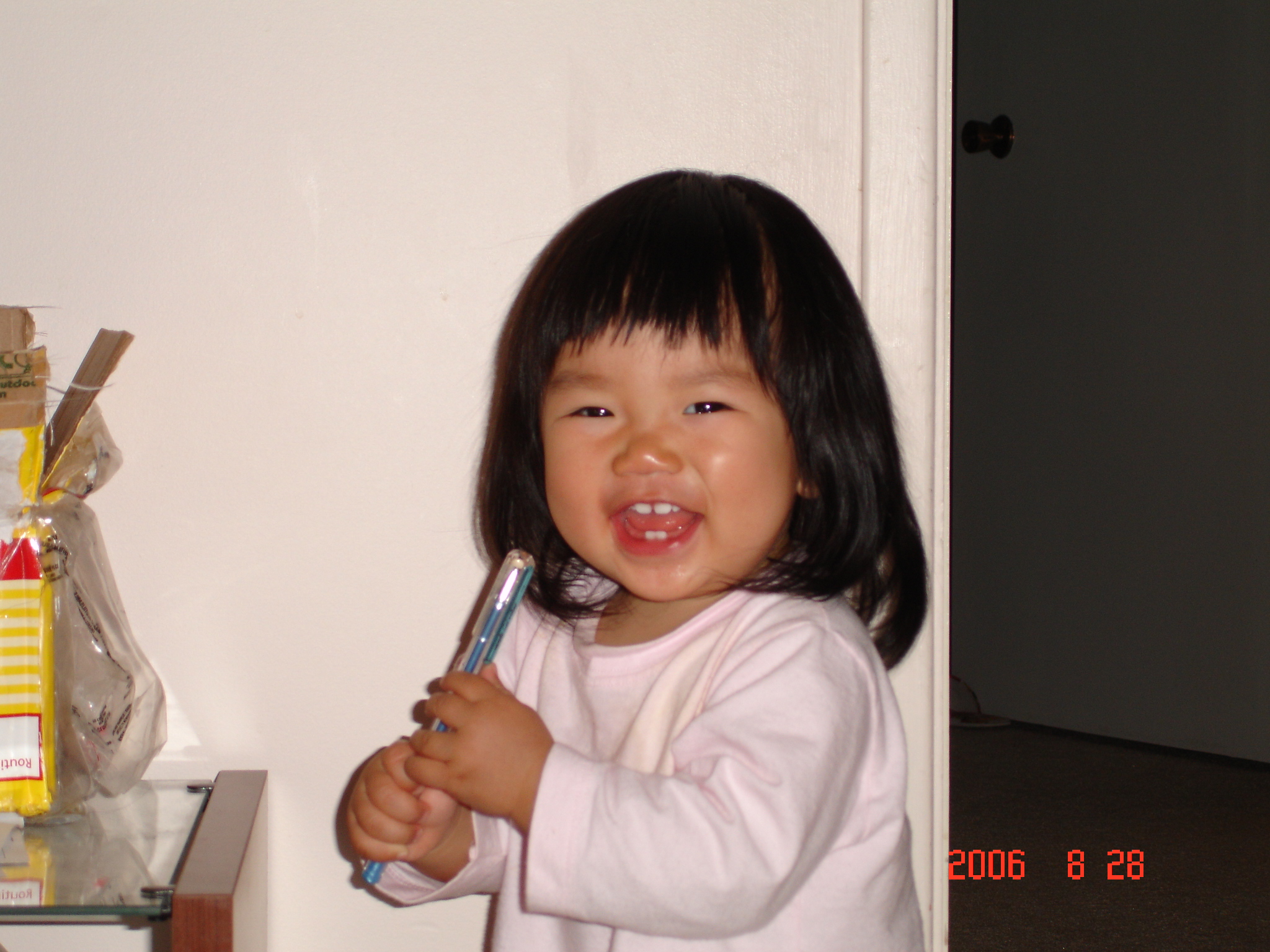 皮皮的Felicia, 明知媽咪說NO~NO~的就是不可為, 還故意先給媽咪一個迷人的微笑, 再把筆筆放下來. 媽咪看著Felicia的微笑, 真的一點都生氣不起來.