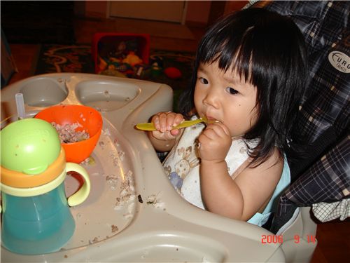 把拔~ 我可以自己用湯匙吃啦~