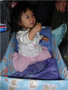 華航空姐給Felicia一個大紙箱當床, Felicia不睡時也可以在裡頭玩, 媽咪覺得是比掛在牆上的床安全多也舒服多了, 不過把拔媽咪的腿卻沒地方放, 一路下來很酸呢.