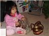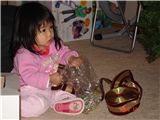 媽咪在裝聖誕樹的燈, Felicia自己坐在一旁玩緞帶.