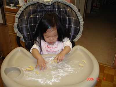 媽咪倒了一些麵粉在桌上, Felicia一看到麵粉就先在桌上把它塗抹開來.