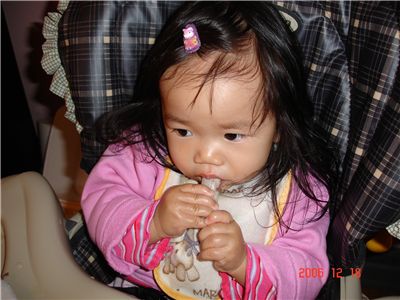 排骨肉吃完了, 沒想到Felicia居然把骨頭拿起來啃, 還啃的吱吱有味, 連骨髓都吃掉了.