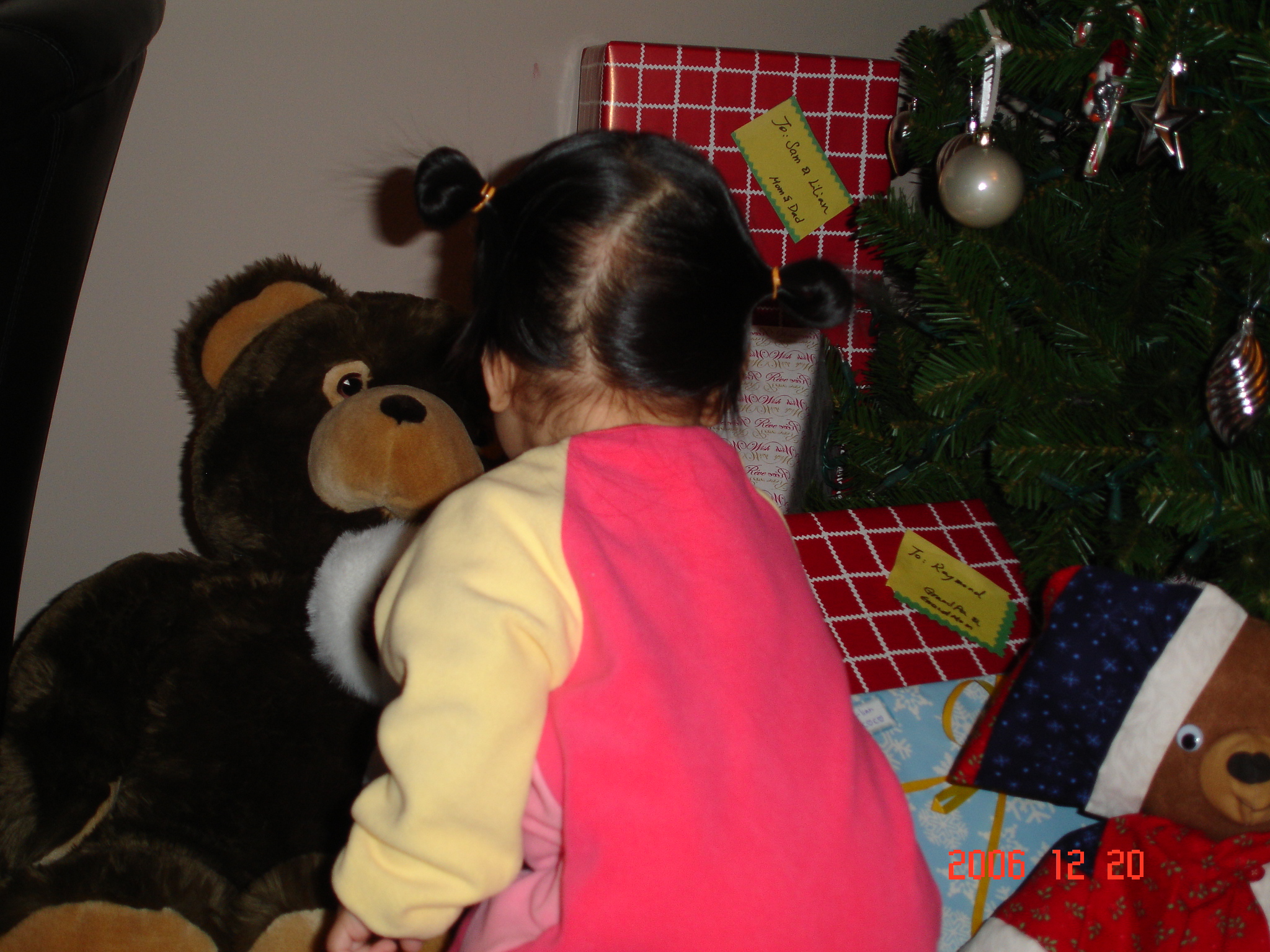 Felicia本來連白熊媽媽都不敢摸的, 現在只剩那隻大黑熊還不敢摸. 剛好讓媽咪拿來擋路進去撕禮物名片條.