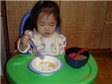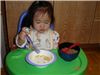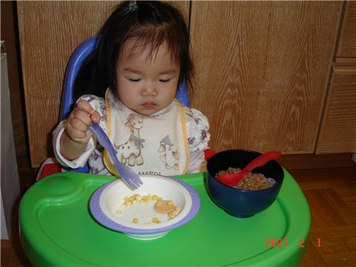 Felicia在等麵麵變涼時先吃乾燥玉米點心