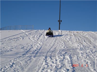 把拔先上去測試一下速度, 結果雪不夠厚, 滑到一半就翻車了.
